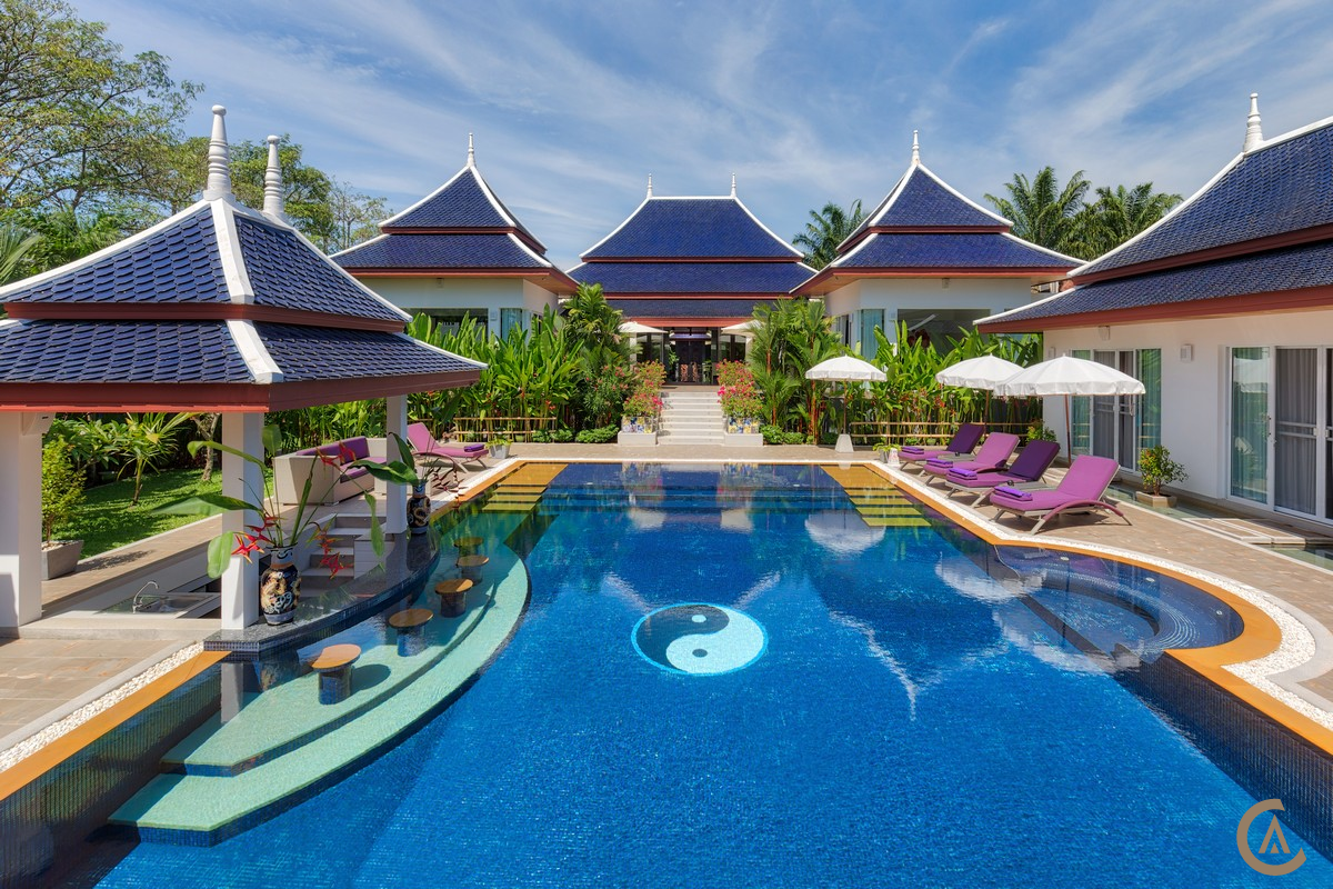 This Villa is a recent modern luxury villa guesthouse situated on the world famous Island : Phuket. Designed respecting the thaï traditionnal style, it is located on a quiet spot of the Island, but very close to every point of interest. Layan Beach is only 6 minutes drive, Boat Avenue (restaurants, bars, shops) only 2 minutes and 20 minutes from the airport. The outdoor spaces for lounging are beautifully designed to insure you the best comfort during your vacation. The 16 x 9 metres pool with its inpool bar and its jacuzzi are the highlights of the Villa. Surrounding it, the sparkling terrace well equiped with private deck chairs and umbrellas, but also huge sofas. Palms, banana trees and colorfoul foliage create a wonderful exotic garden.