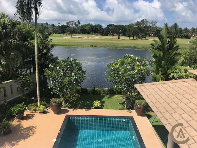 ATTRACTIVE INVESTMENT OPPORTUNITY -The house in the prestigious estate has a large balcony overlooking the widest section of the klong (little canal) golf course Cherngtalay hills and a most colourful sky at sunset. It is surrounded by a landscaped garden both in front and back. The front too has an open view. It has a large living/dining room upstairs that opens up to the balcony and a living/study room downstairs leading to a spacious verandah/bar swimming g pool area and a beautiful Sala. It stands on a plot of 904 sqm and an additional 50 sqm passage to the klong is also under the care of the owner. The covered area is over 500 sqm. It consists of a large bedroom and bathroom upstairs and two en-suite bedrooms downstairs plus the living/study room that can be used as a bedroom. The Sala in front and the driveway can accommodate three cars. It is fronted by a low level curved wall that does not obstruct the view of the lovely garden. The electric door is in proportion to the wall in size. The house completed in 2002 has been upgraded constantly. About five years ago the entire Thai roof was replaced with a much more practical Balinese style roof and tiles that don’t discolor. More recently all 22 wooden windows have been replaced with alluminium frames and floors with elegant tiles more suitable for tropical climate free of termite. Two of the three bathrooms have been totally remodeled in modern design. The teen-aged daughter’s room is a done in joyful pastel colours and has the unlimited view of the fairway and the hills. The family of three love the house and have taken extreme care of it. The reason they are selling it is because they want to downsize their residence as their daughter leaves for college in the near future. Extra information: Both the swimming pool and one of the bathrooms has a Jacuzzi. The maid’s room has attached bathroom TV fan and opens out to the garden. Next to it is the store room. Also a new laundry room has just been added to one of the bathrooms near the maid’s room. The kitchen is a blend of Western and Thai style with a sliding door between the pantry and the kitchen. On top of the stairs is a hall leading to the Living room. This can be easily converted either into a guest room or a bathroom. There is storage cupboard attached to the wall on the side garden for implements and other stuff. A smaller structure near it is meant for storage of a gas cylinder (for safety) connected to the stove upstairs. There is both a gas hob and two electric hobs and an oven. The pool pump room is covered with ivy and fits well with the layout of the garden and a little herb area opposite it.