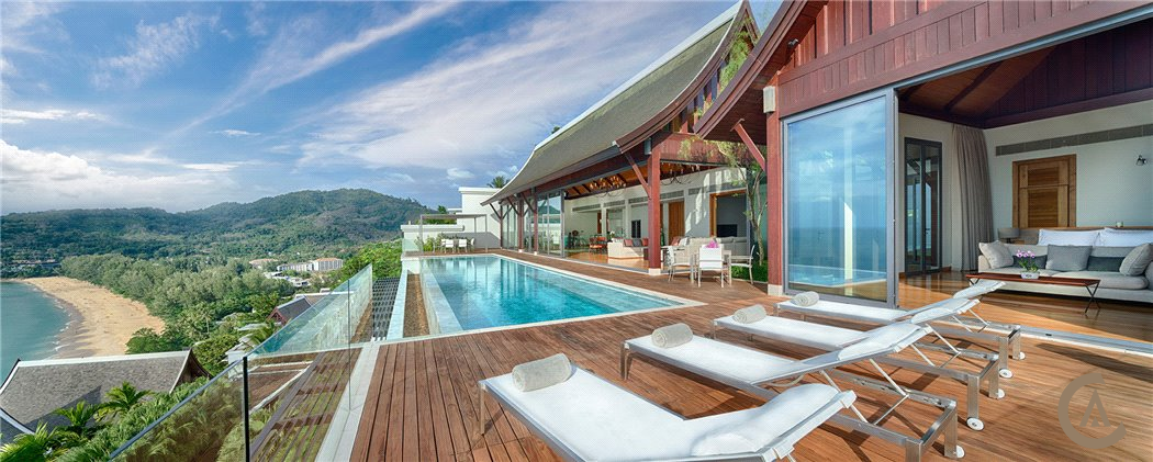 This villa boasts an incredible panoramic view over Naithon Beach and the Andaman Sea. The uniqueness of this villa is its enviable position. Being an end plot, on a lush forested slope and set within an established and exclusive villa development ensures that living here is a secure, beautiful and peaceful experience from the moment you move in.The 7 metre ceilings create a sense of space and openness. There is a pool-side master suite, large entertaining sala and the living-dining areas open out onto the pool deck – all of which can be overlooked from the privacy of the roof deck.There are four further guest suites on the lower level each with a wonderful view of the ocean and a large multi-purpose room perfect for use as a gym, games room, spa or cinema.Keeping privacy and peace in mind, the design of this villa works so well as all the living and entertaining areas are on the ground floor and all the sleeping is arranged together on the lower ground floor.This Thai inspired villa benefits from plenty of storage space for sporting equipment, a two car garage, maid’s quarters, laundry, kitchen and 25 metre infinity swimming pool.