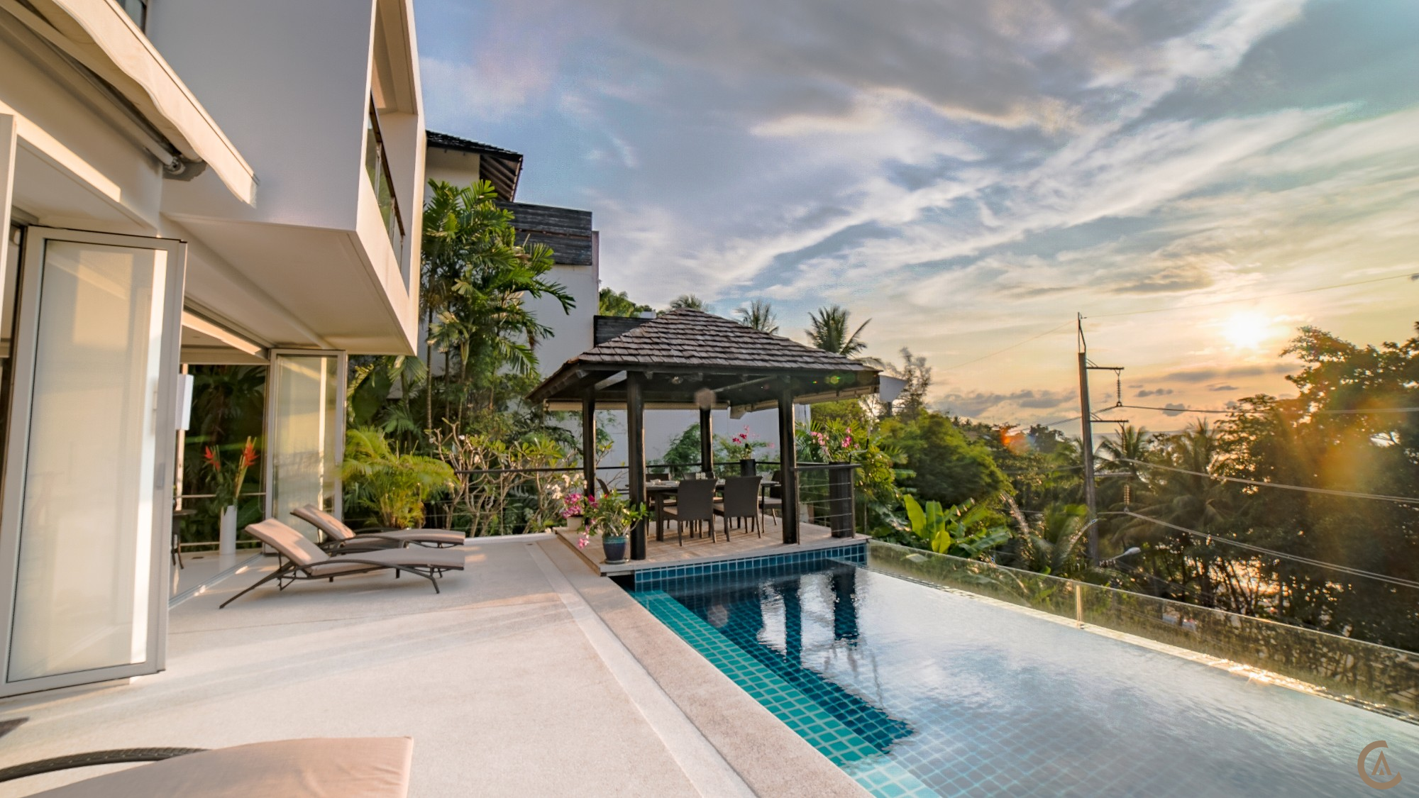 An innovative version of a modern designed sea view pool villa, just steps from Phuket’s famed and exclusive Surin Beach.The villa has spectacular, elevated views of the pristine Surin Beach and the crystal-clear waters of the Andaman Sea. A mere 200 metre walk to reach these golden, tropical sands. Construction of this modern-styled villa was completed in 2006. The architect, Naga Concepts, created an innovative design that has been matched by high quality construction to produce a property that is not only aesthetically pleasing, but also low on maintenance and high on longevity.The well-considered design incorporates a perceptive use of light and space, the blending of internal and external spaces, the careful positioning of windows to ensure privacy and much more.This villa has 400 sqm of built area, across four floors. The entrance is on the second highest floor, as is the two-car garage and paved driveway for a further two cars.Across the threshold, a small foyer awaits. In front the light, spacious and open-plan lounge, dining and kitchen. To the right, stairs up to the roomy master bedroom suite.The heart of the property is the living area. With a comfortable lounge to one side of this light and airy space, and a more formal dining area sits in front of a very high standard fully fitted kitchen with prestige appliances. This is complemented by masses of storage along the external wall.This space is surrounded by story height, bi-folding glass windows which open to effortlessly merge the internal space with the outside world.Outside a large deck area with sunbeds surrounds a private infinity pool. A traditional Thai sala provides seating and shade.All of which enjoy fantastic sea views, amazing sunsets as well as the cooling ocean breezes.This outdoor space can be enjoyed regardless of weather conditions due to the electrically operated awning that provides both shade and shelter from the elements.The master bedroom is complete with four poster bed, private sea view balcony and a stunning bathroom with a large white terrazzo bathtub. Beautiful timber floors are laid throughout the large bedroom.The lower floors consist of three further en-suite bedrooms, although one of which is currently being used as a less formal lounge/TV room. The other two bedrooms have views across to the beach on the front of the house. All have private bathrooms with showers. On this floor is a further laundry, utility, maid’s room. Which can of course become secure storage should any buyer consider renting the property.The property contains everything you need to move in. It comes fully furnished, with contents and equipment.The estate has in place world class property management by Knight Frank, with an office on site. All common areas are excellently maintained and managed; from the 24-hour security to the common tropical garden areas.To summarize; any buyer will be acquiring luxurious accommodation in an excellent condition, with stunning sea and beach views, cool ocean breezes, absolute privacy with extremely easy access to the beach.Ownership is flexible, currently via BVI structure.