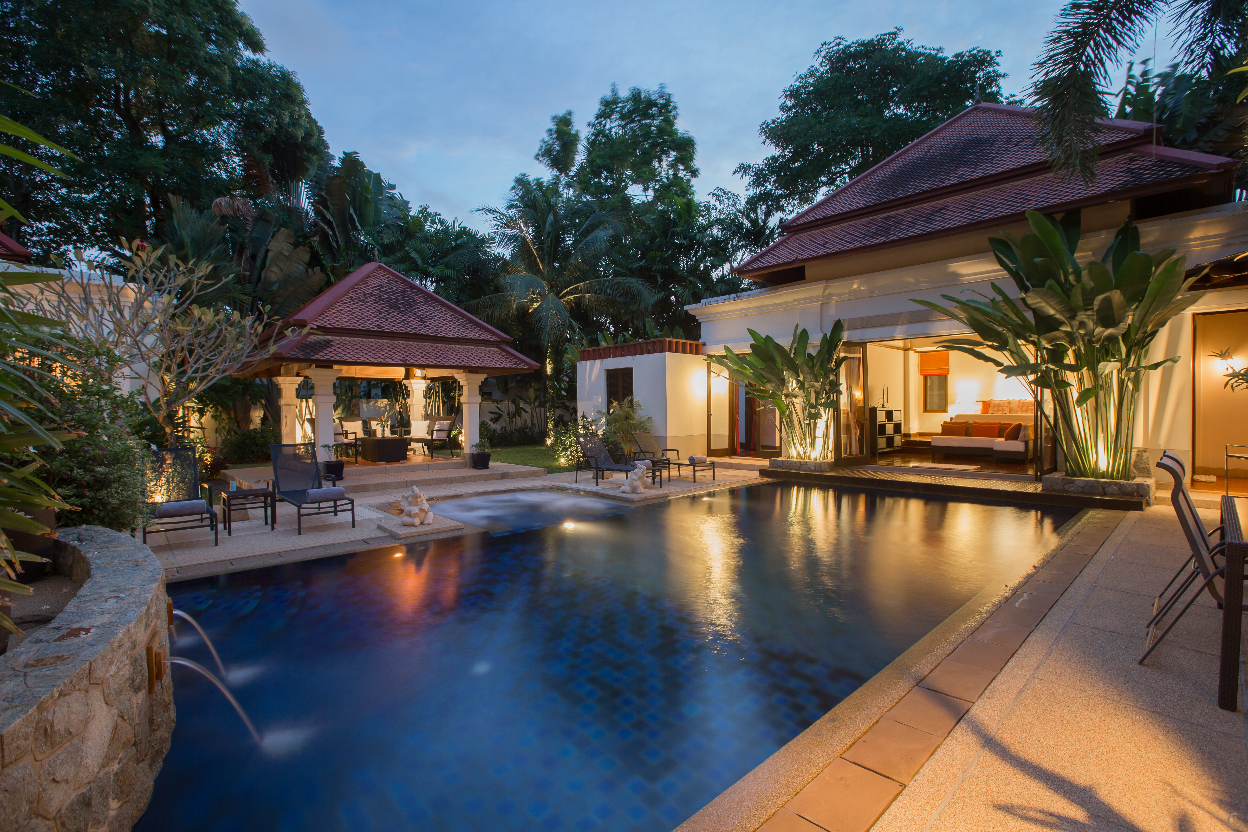 This luxurious private pool villa is situated close to Bangtao Beach on the west coast of Phuket near the entrance to the popular Laguna resort complex. The villa is on over 1000 sqm land plot, very well maintained and fully furnished. The villa features a separate lounge, dining room, open western kitchen and maids quarters. All rooms open on to the pool, the main focus of the home via concertina glass and hardwood doors and beautifully landscaped gardens surrounded by high walls for privacy. The guest villa or 4th bedroom, is very well appointed with a sitting area and ensuite bathroom but fully self contained in a separate villa.