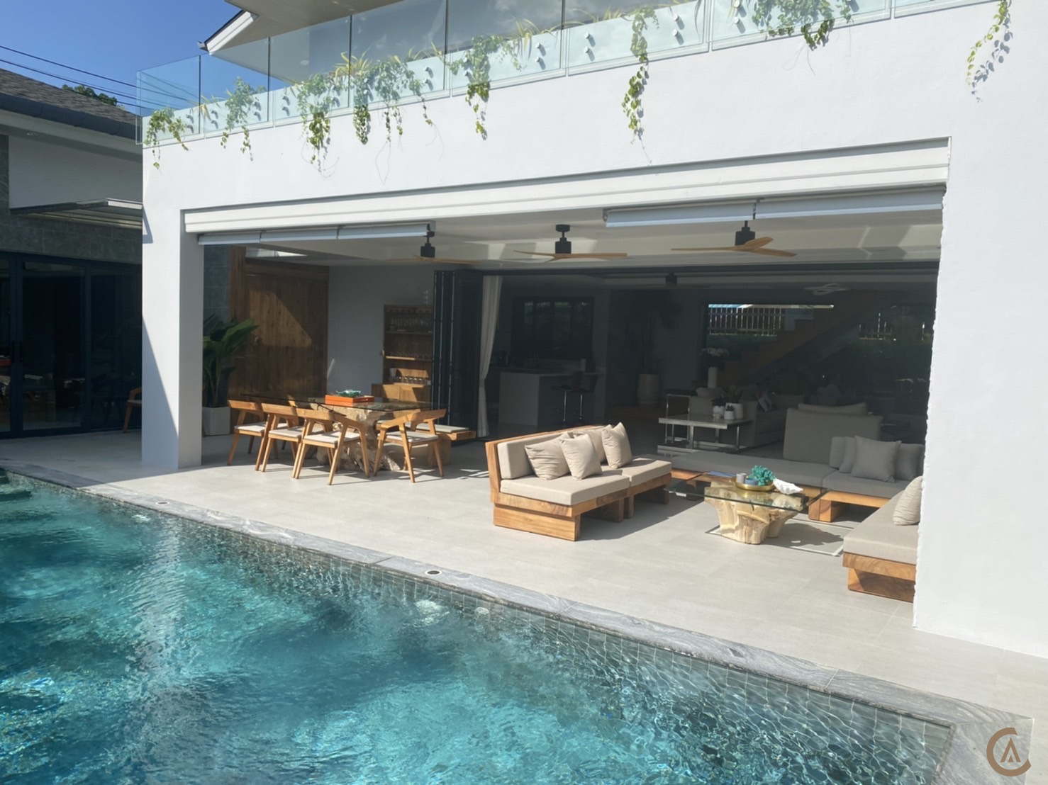 This stand alone four bedroom pool villa has two floors both levels are beautifully designed in modern style culminating in extremely large 400 sq meter indoor/outdoor private living space. After entering to the ground floor you will immediately experience the villa’s indoor and outdoor living are with private pool sun terrace and modern fully equipped kitchen with indoor and outdoor dining area. The villa is quipped with fiber optic WIFI cable TV and cinema room.